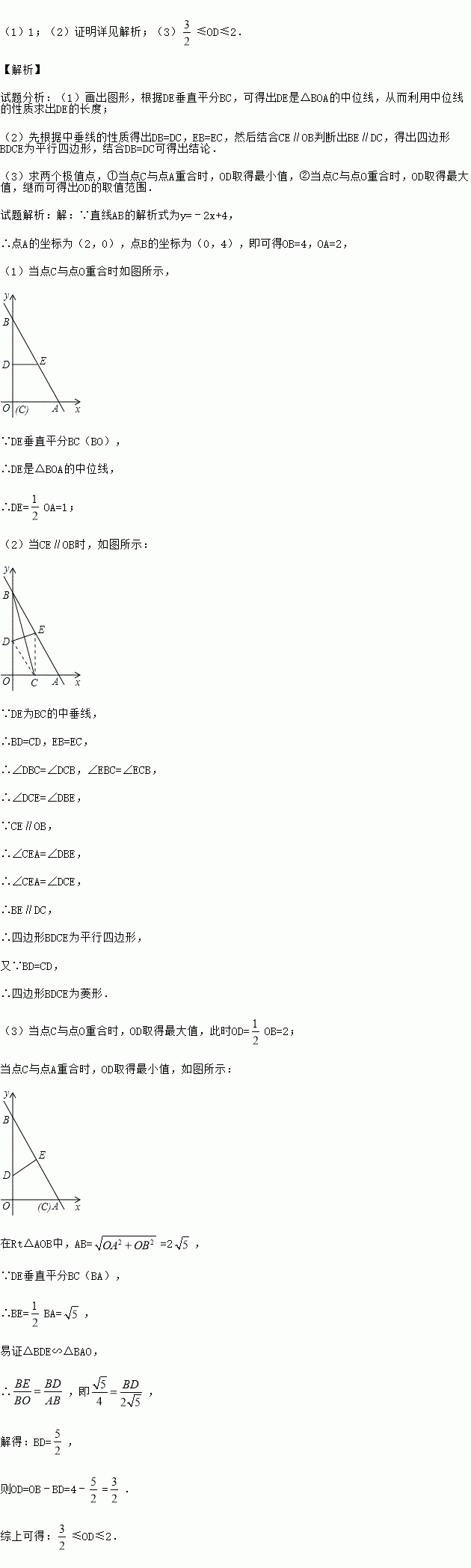 如图1,已知直线y=﹣2x+4与两坐标轴分别交于点A、B,点C为线段OA上一动点,连接BC,作BC的中垂线分别交OB、AB交于点D、E.