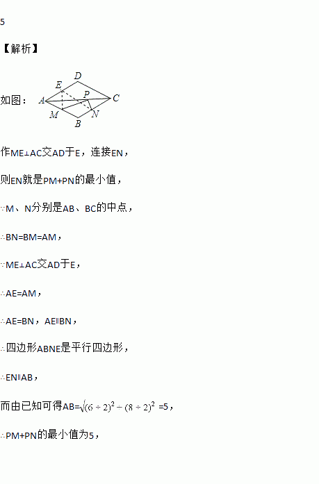 如图,菱形ABCD的两条对角线分别长6和8,点P是对角线AC上的一个动点,点M、N分别是边AB、BC的中点,则PM+PN的最小值是________.