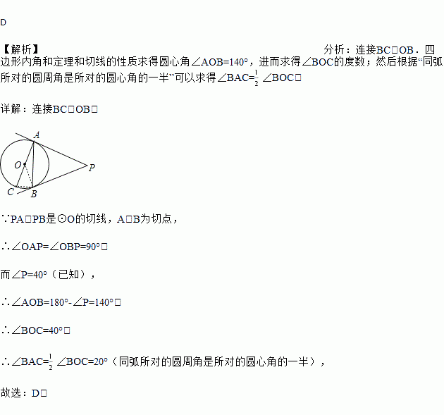 如图,PA、PB是⊙O的切线,A、B是切点,AC是⊙O的直径,∠P=40°,则∠BAC的大小是( )