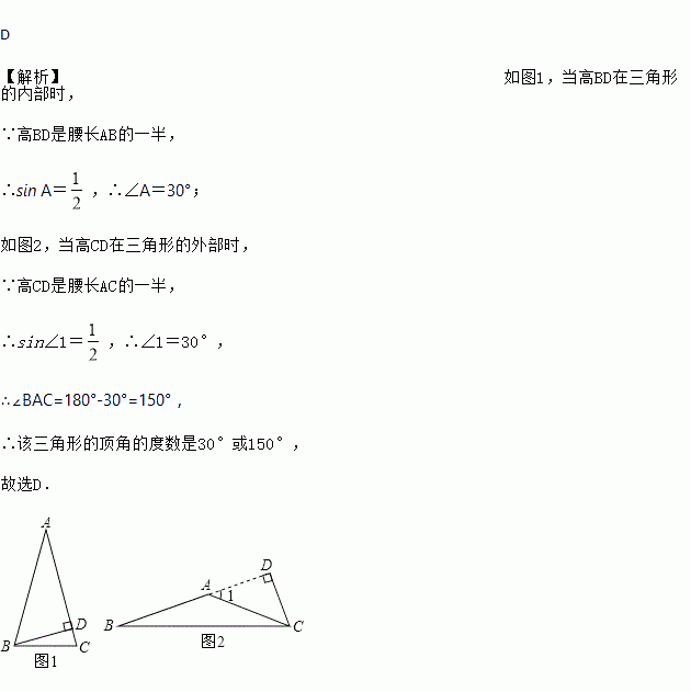 等腰三角形一腰上的高与腰长之比是1?2,则等腰三角形顶角的度数为( )