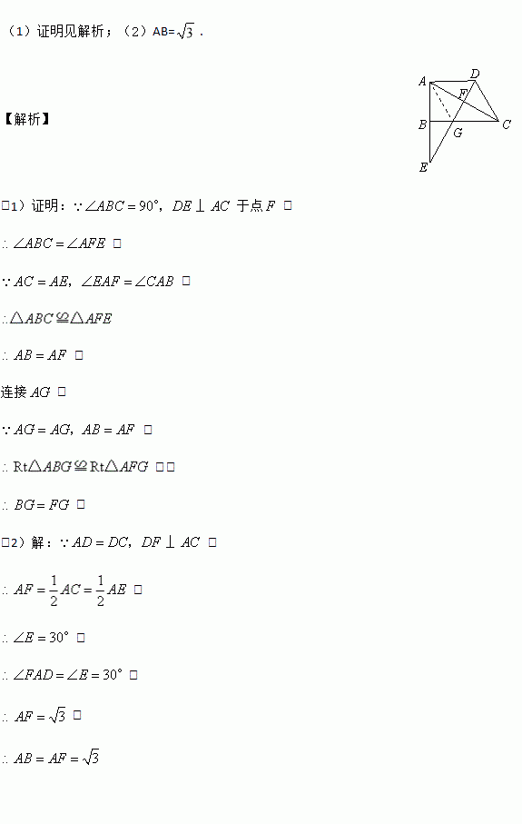(1)证明见解析;(2)AB=. 【解析】 (1)证明:于点, . , . 连接, , .) . (2)【解析】 , . . , .