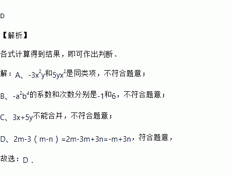 D. 2m﹣3(m﹣n)=﹣m+3n