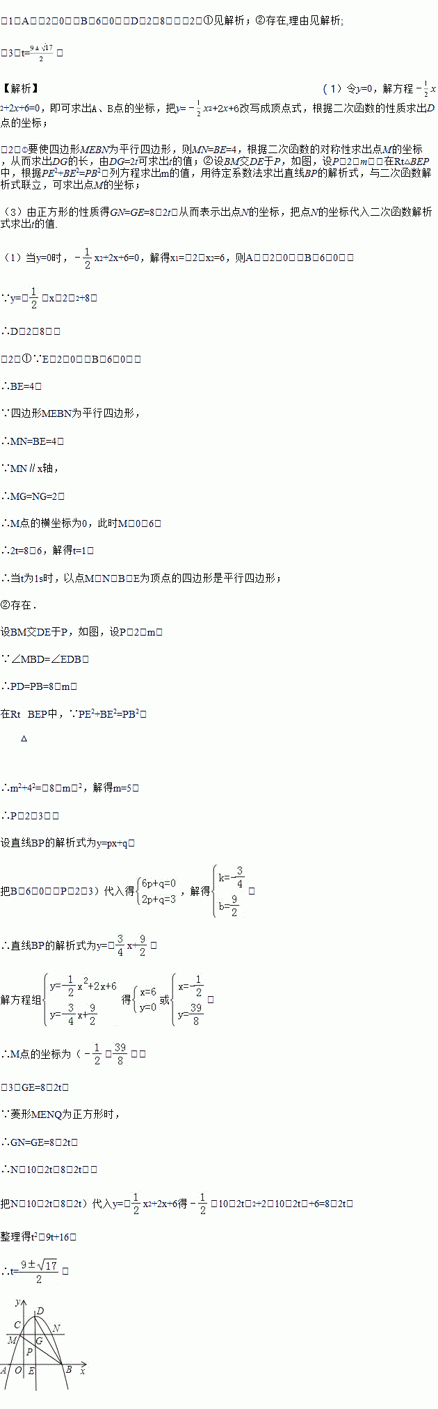①当t为何值时,以点M,N,B,E为顶点的四边形是平行四边形;
