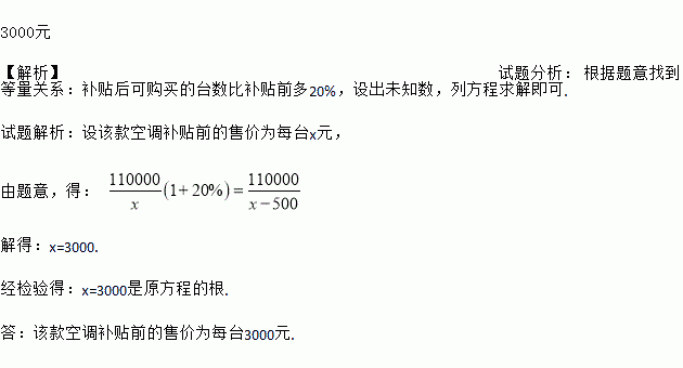 国家实施高效节能电器的财政补贴政策,某款空调在政策实施后,客户每购买一台可获补贴500元.若同样用11万元所购买此款空调,补贴后可购买的台数比补贴前多20%,则该款空调补贴前的售价为每台多少元?