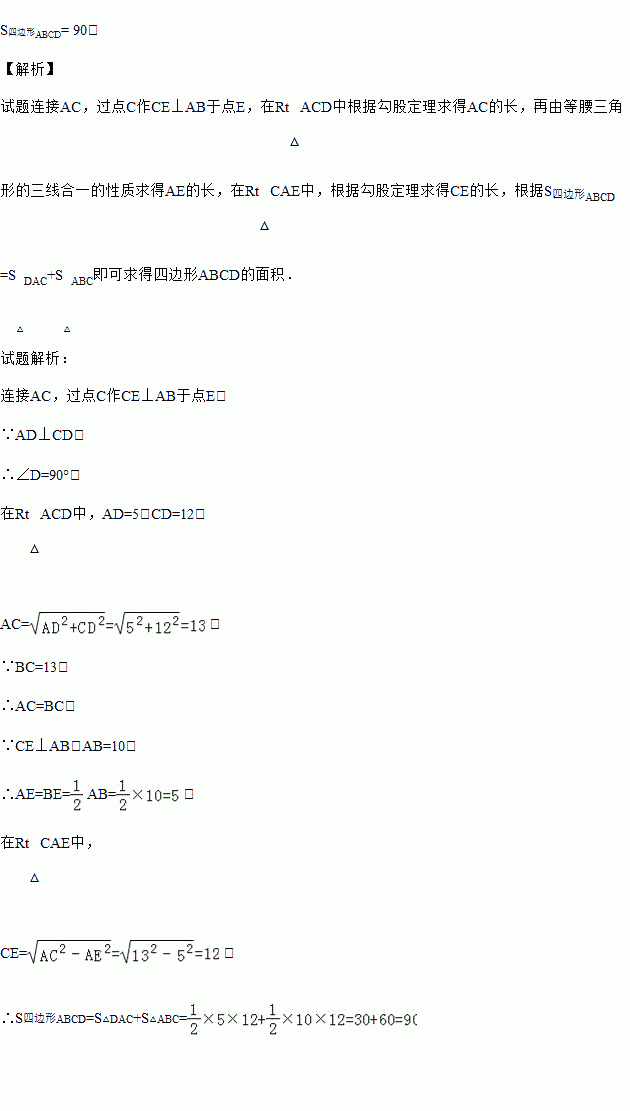 如图,四边形ABCD中,AB=10,BC=13,CD=12,AD=5,AD⊥CD,求四边形ABCD的面积.