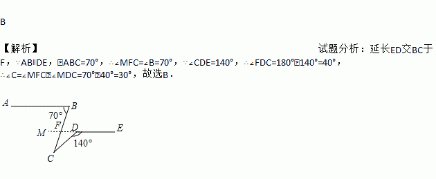 如图,已知AB∥DE,∠ABC=70°,∠CDE=140°,则∠BCD的值为( )
