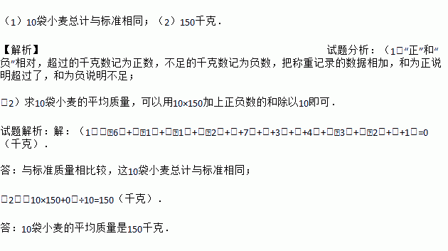 (1)10袋小麦总计与标准相同;(2)150千克. 【解析】试题分析:(1)“正”和“负”相对,超过的千克数记为正数,不足的千克数记为负数,把称重记录的数据相加,和为正说明超过了,和为负说明不足; (2)求10袋小麦的平均质量,可以用10×150加上正负数的和除以10即可. 试题解析:【解析】 (1)(﹣6)+(﹣1)+(﹣1)+(﹣2)+(+7)+(+3)+(+4)+(﹣3)...