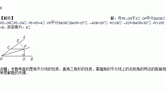 如图,OP平分∠AOB,∠AOP=15°,PC∥OB,PD⊥OB于点D,PD=4,则PC等于 .