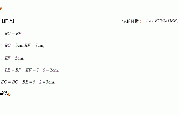 如图,△ABC≌△DEF,点A与D,B与E分别是对应顶点,且测得BC=5cm,BF=7cm,则EC长为( )cm.