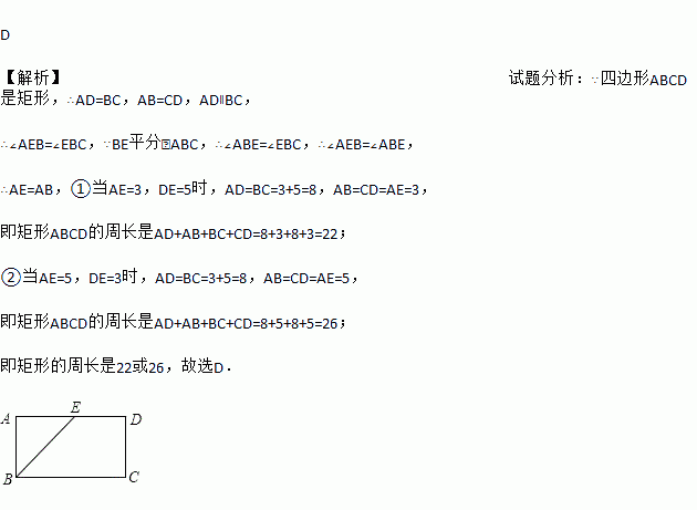 D 【解析】试题分析:∵四边形ABCD是矩形,∴AD=BC,AB=CD,AD∥BC, ∴∠AEB=∠EBC,∵BE平分∠ABC,∴∠ABE=∠EBC,∴∠AEB=∠ABE, ∴AE=AB,①当AE=3,DE=5时,AD=BC=3+5=8,AB=CD=AE=3, 即矩形ABCD的周长是AD+AB+BC+CD=8+3+8+3=22; ②当AE=5,DE=3时,AD=BC=...