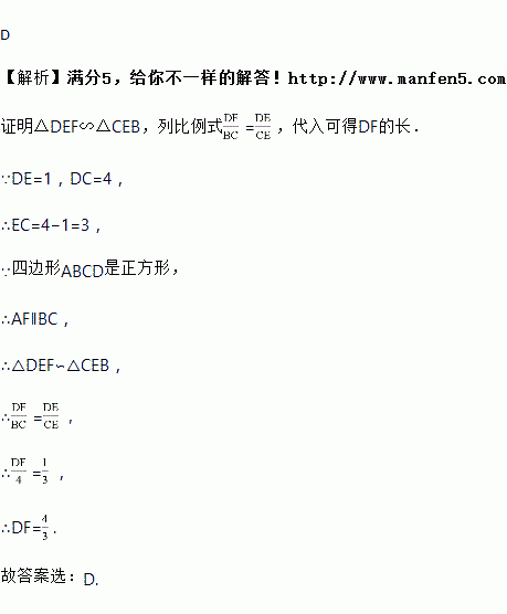 如图,正方形ABCD的边长为4,点E在边DC上,且DE=1,BE与AD的延长线交于点F,则DF的长度为( )