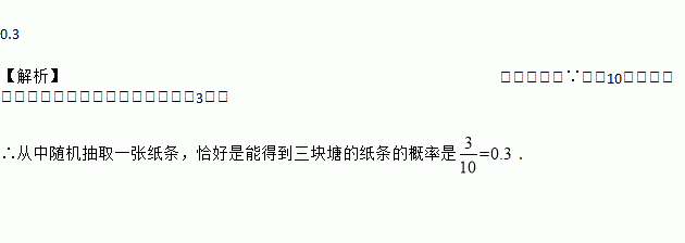 0.3 【解析】试题解析:∵共有10张质地均匀的纸条,能得到三块塘的纸条有3张, ∴从中随机抽取一张纸条,恰好是能得到三块塘的纸条的概率是.