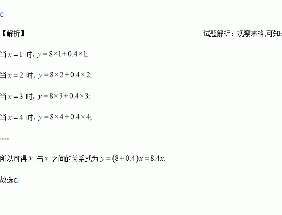 A. y=8+0.4x B. y=8+0.4 C. y=8.4x D. y=8.4x+0.4