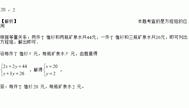 根据下图提供的信息,求每件恤衫和每瓶矿泉水的价格.
