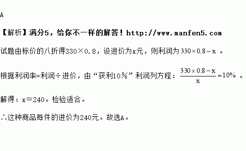 某种商品每件的标价是330元,按标价的八折销售时,仍可获利10%,则这种商品每件的进价为