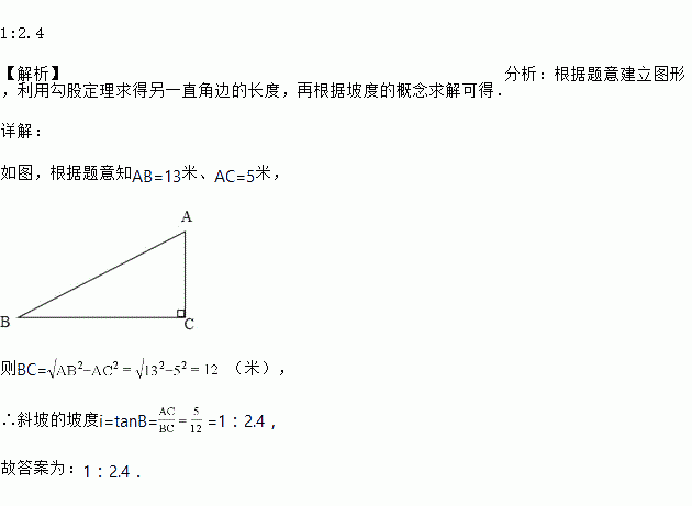 如果一个滚筒沿斜坡向正下直线滚动13米后,其水平高度下降了5米,那么该斜坡的坡度i=_____.