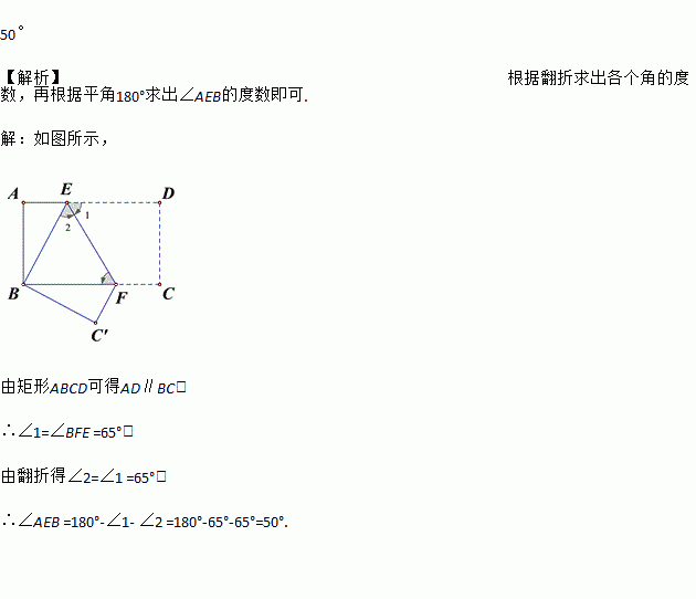 如图,矩形ABCD中将其沿EF翻折后,D点恰落在B处,∠BFE= 650,则∠AEB=____________.
