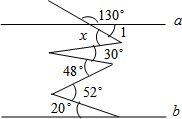 ∴x+48°+20°=∠1+30°+52°,