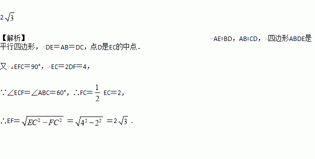 如图,平行四边形ABCD中,∠ABC=60°,E、F分别在CD、BC的延长线上,AE∥BD,EF⊥BC,DF=2,则EF=________.
