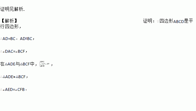 已知如图在平行四边形ABCD中,E、F是对角线AC上的两点,且AE=CF,求证:∠AED=∠CFB.