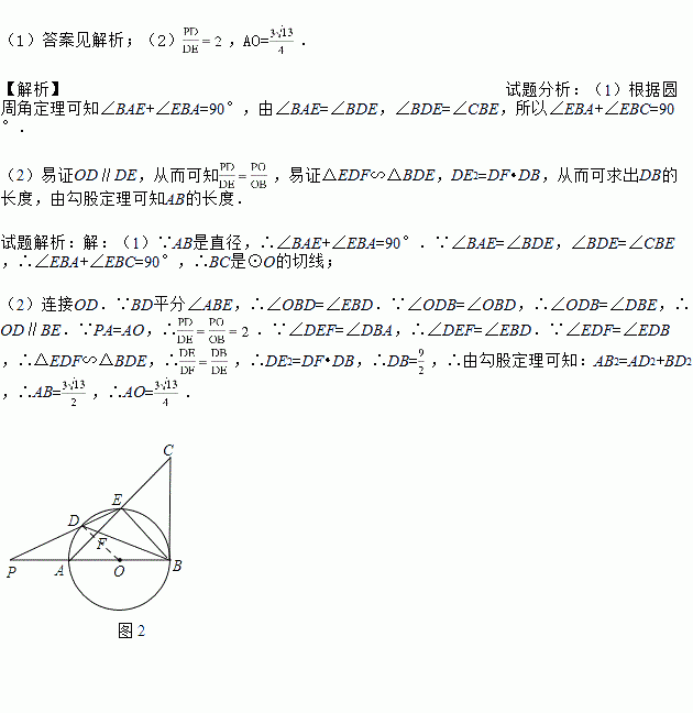 如图1,以△ABC的边AB为直径作⊙O,交AC边于点E,BD平分∠ABE交AC于F,交⊙O于点D,且∠BDE=∠CBE.