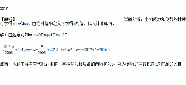 已知,m、n互为相反数,p、q互为倒数,的绝对值为,求的值.