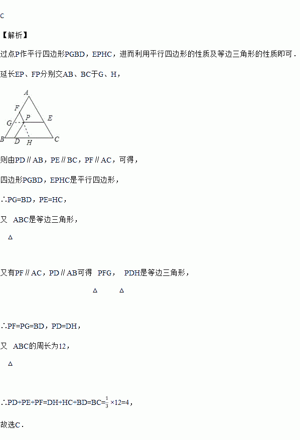 如图,△ABC是等边三角形,点P是三角形内的任意一点,PD∥AB,PE∥BC,PF∥AC,若△ABC的周长为12,则PD+PE+PF=( )