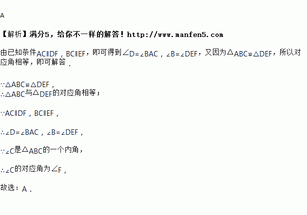 如图,△ABC≌△DEF,BC∥EF,AC∥DF,则∠C的对应角是( )