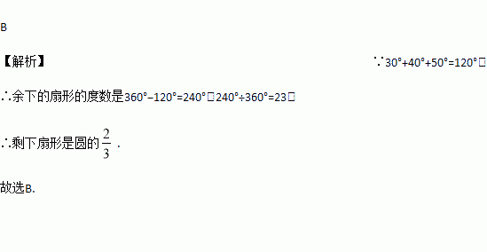 如图所示的扇形的圆心角度数分别为30°,40°,50°,则剩下扇形是圆的( )