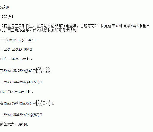如图:有一个直角三角形ABC,∠C=90°,AC=10,BC=5,一条线段PQ=AB,P、Q两点分别在AC和过点A且垂直于AC的射线AX上运动,问P点运动到离A的距离等于___________时,ΔABC和ΔPQA全等.