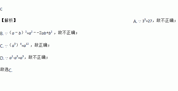 A. 33=9 B. (a﹣b)2=a2﹣b2 C. (a3)4=a12 D. a2•a3=a6
