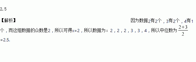 已知一组数据:2 ,2, ,3 ,3 ,4.若众数是2,则中位数是 .