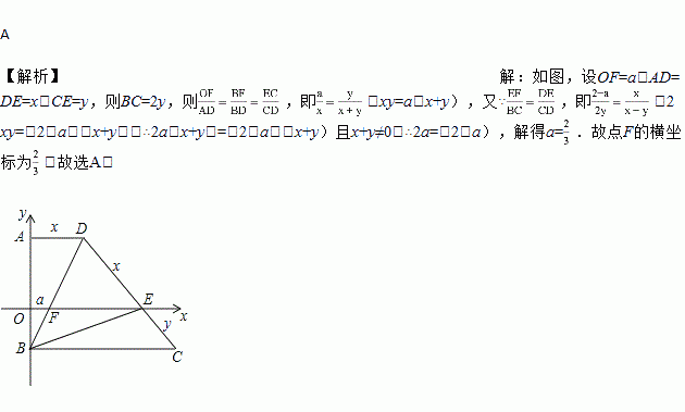 如图,AD∥BC,AD⊥AB,点A,B在y轴上,CD与x轴交于点E(2,0),且AD=DE,BC=2CE,则BD与x轴交点F的横坐标为( )