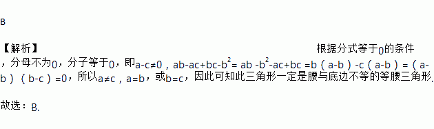 B 【解析】根据分式等于0的条件,分母不为0,分子等于0,即a-c≠0,ab-ac+bc-b2= ab -b2-ac+bc =b(a-b)-c(a-b)=(a-b)(b-c)=0,所以a≠c,a=b,或b=c,因此可知此三角形一定是腰与底边不等的等腰三角形. 故选:B.