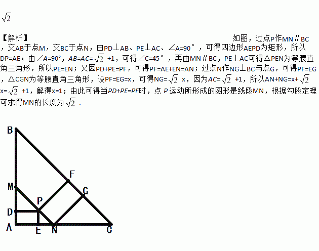 +1,P 是△ABC 内一个动点,PD⊥AB、PE⊥AC、PF⊥BC,垂足分别为 D、E、F,且 PD+PE=PF.则点 P 运动所形成的图形的长度是__________.