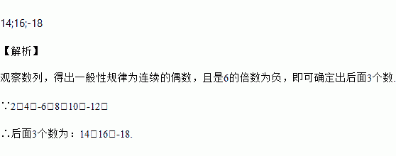 根据规律,写出后面的三个数:2,4,-6,8,10,-12,____,____,____,….