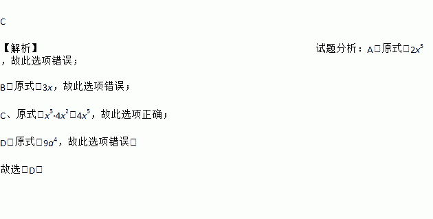 C. x3•(2x)2=4x5 D. (﹣3a2)2=6a2