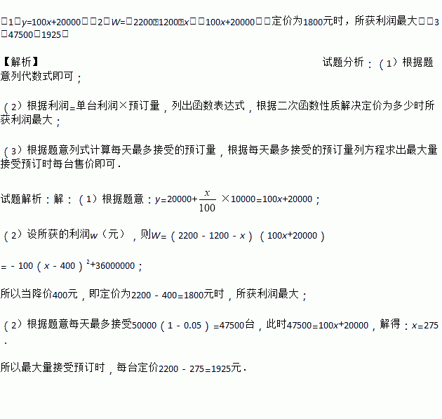 (3)若手机加工厂每天最多加工50000台,且每批手机会有5%的故障率,通过计算说明每天最多接受的预订量为多少?按最大量接受预订时,每台售价多少元?