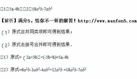 (1)2a-5b+3a+b; (2)3(2a2b-ab2)-4(ab2-3a2b).