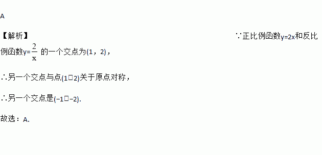 A 【解析】∵正比例函数y=2x和反比例函数y=的一个交点为(1,2), ∴另一个交点与点(1,2)关于原点对称, ∴另一个交点是(?1,?2). 故选:A.