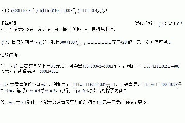 (2)在不考虑其他因素的条件下,当m定为多少时,才能使该店每天获取的利润是420元,并且卖出的粽子更多?