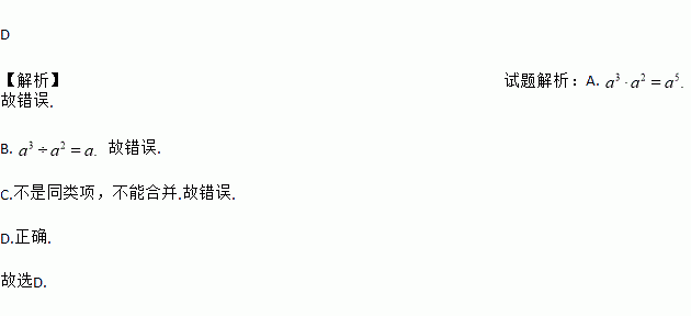 A. a3•a2=a6 B. a3÷a2=