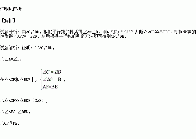 如图,点E、F在AB上,且AF=BE,AC=BD,AC∥BD.求证:CF∥DE.