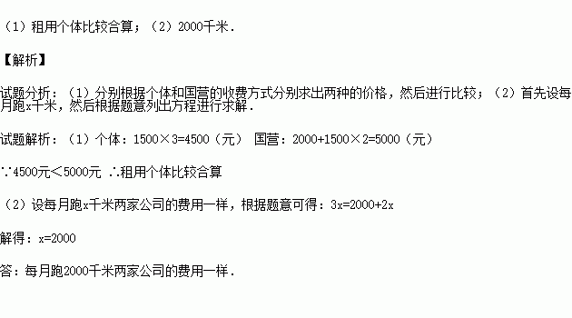 某单位急需用车,但又不需买车,他们准备和一个个体车主或一国营出租公司中的一家签定月租车合同,个体车主的收费是3元/千米,国营出租公司的月租费为2000元,另外每行驶1千米收2元,这个单位若每月平均跑1500千米,租用哪个公司的车比较合算?每月跑多少千米两家公司的费用一样?