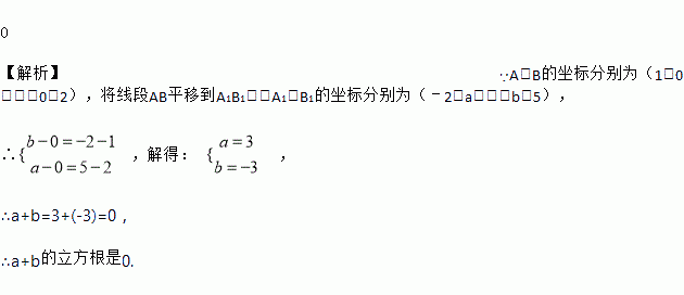 0 【解析】∵A,B的坐标分别为(1,0),(0,2),将线段AB平移到A1B1后,A1,B1的坐标分别为(﹣2,a),(b,5), ∴,解得: , ∴a+b=3+(-3)=0, ∴a+b的立方根是0.