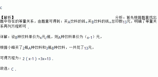 A种饮料比B种饮料单价少1元,小峰买了2瓶A种饮料和3瓶B种饮料,一共花了13元,如果设B种饮料单价为x元/瓶,那么下面所列方程正确的是( )