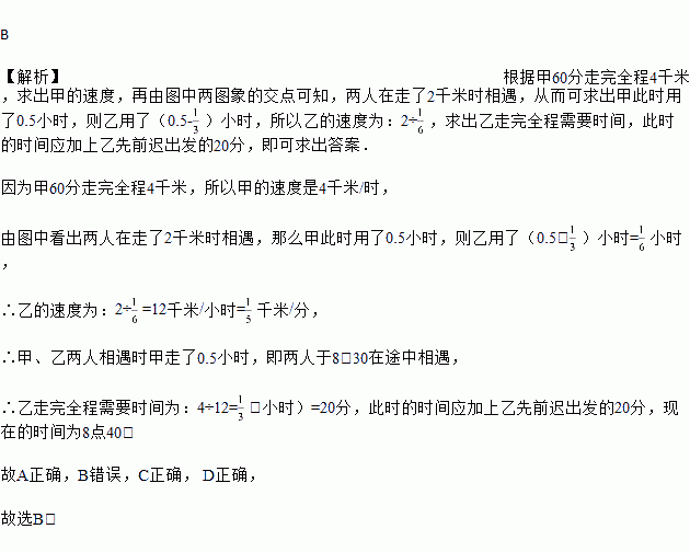 已知A,B两地相距4千米,上午8:00时,甲从A地步行到B地,8:20时乙从B地出发骑自行车到A地,甲、乙两人离A地的距离y(千米)与甲所用的时间x(分)之间的关系如图所示,则下列说法错误的是 ( )