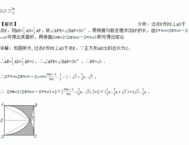 如图,正方形ABCD的边长为2,分别以A、D为圆心,2为半径画弧BD、AC,则图中阴影部分的面积为_____.