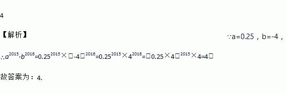 4 【解析】∵a=0.25,b=-4, ∴a2015·b2016=0.252015×(-4)2016=0.252015×42016=(0.25×4)2015×4=4, 故答案为:4.