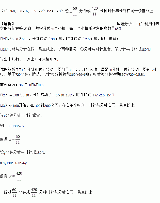 (1)360,60,6,0.5.(2)15°;(3)经过分钟或分钟时针与分针在同一条直线上. 【解析】试题分析:(1)利用钟表盘的特征解答.表盘一共被分成60个小格,每一个小格所对角的度数是6°; (2)从5:00到5:30,分针转动了30个格,时针转动了2.5个格,即可求解; (3)时针与分针在同一条直线上,分两种情况:①分针与时针重合;②分针与时针成180°, 设出未知...